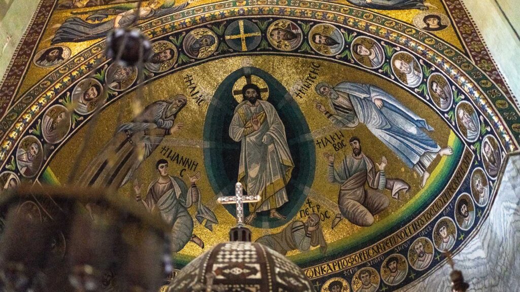 Το λαμπρότερο, ωστόσο, σημείο του ναού αποτελεί η κόγχη του ιερού, διακοσμημένη με ένα από τα σημαντικότερα ψηφιδωτά της εποχής του Ιουστινιανού, από τα ελάχιστα που διασώθηκαν στην Ανατολική Μεσόγειο. Η κεντρική παράσταση απεικονίζει τη Μεταμόρφωση του Χριστού, με τους προφήτες Μωυσή και Ηλία, που και οι δύο έδρασαν στην έρημο του Σινά. Σε δευτερεύουσες συνθέσεις παρουσιάζονται σιναϊτικά επεισόδια από τη ζωή του προφήτη Μωυσή: το όραμα της Ακατάφλεκτης Βάτου και η παραλαβή των Εντολών. Τέλος, σε κεντρικό σημείο εικονίζεται ο βασιλιάς και προφήτης Δαυίδ, παράσταση που οι ιστορικοί ερμηνεύουν ως έμμεση αναφορά στον ίδιο τον Ιουστινιανό.