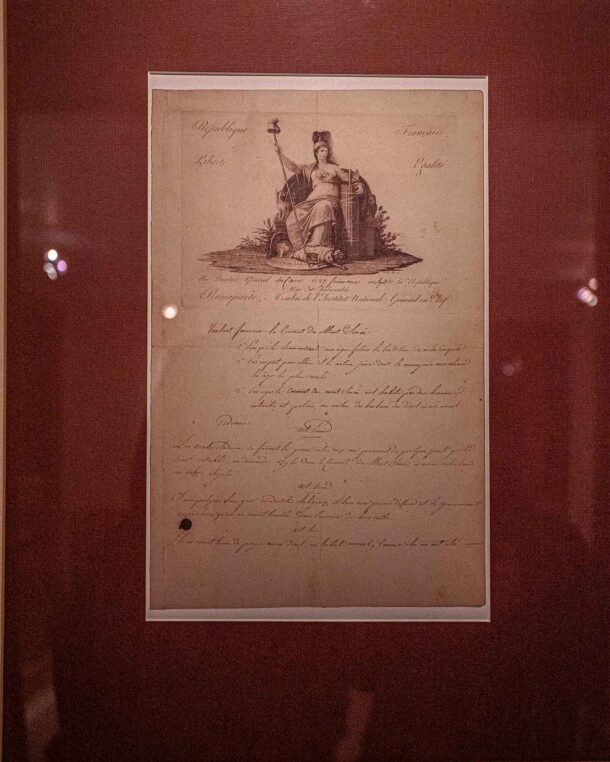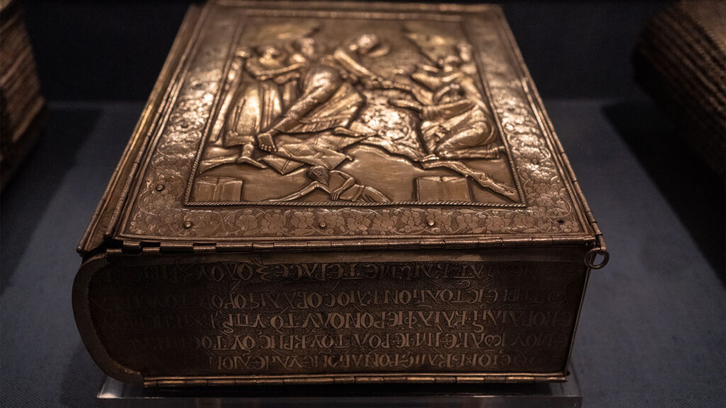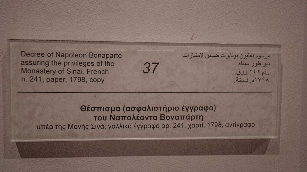 Στο Σκευοφυλάκιο εκτίθεται και μικρός αριθμός χειρογράφων από το πλήθος της Σιναϊτικής Βιβλιοθήκης, κυρίως τα πλουσιότερα σε μινιατούρες. Παράλληλα, με αφορμή την περιπετειώδη ιστορία του Σιναϊτικού κώδικα, πολύτιμου χειρογράφου του Δ ́ αιώνα που αποσπάστηκε δόλια από τη μονή το 1859 και κατακρατήθηκε στην τσαρική Ρωσία μέχρι την πώλησή του από την κυβέρνηση της ΕΣΣΔ στο Βρετανικό Μουσείο, στον ίδιο χώρο παρουσιάζονται οι εξαντλητικές διπλωματικές πιέσεις που δέχτηκε κατά καιρούς η Σιναϊτική αδελφότητα για τη διαχείριση των κειμηλίων της και αποδεικνύεται η υψηλή συνείδηση της αποστολής της.