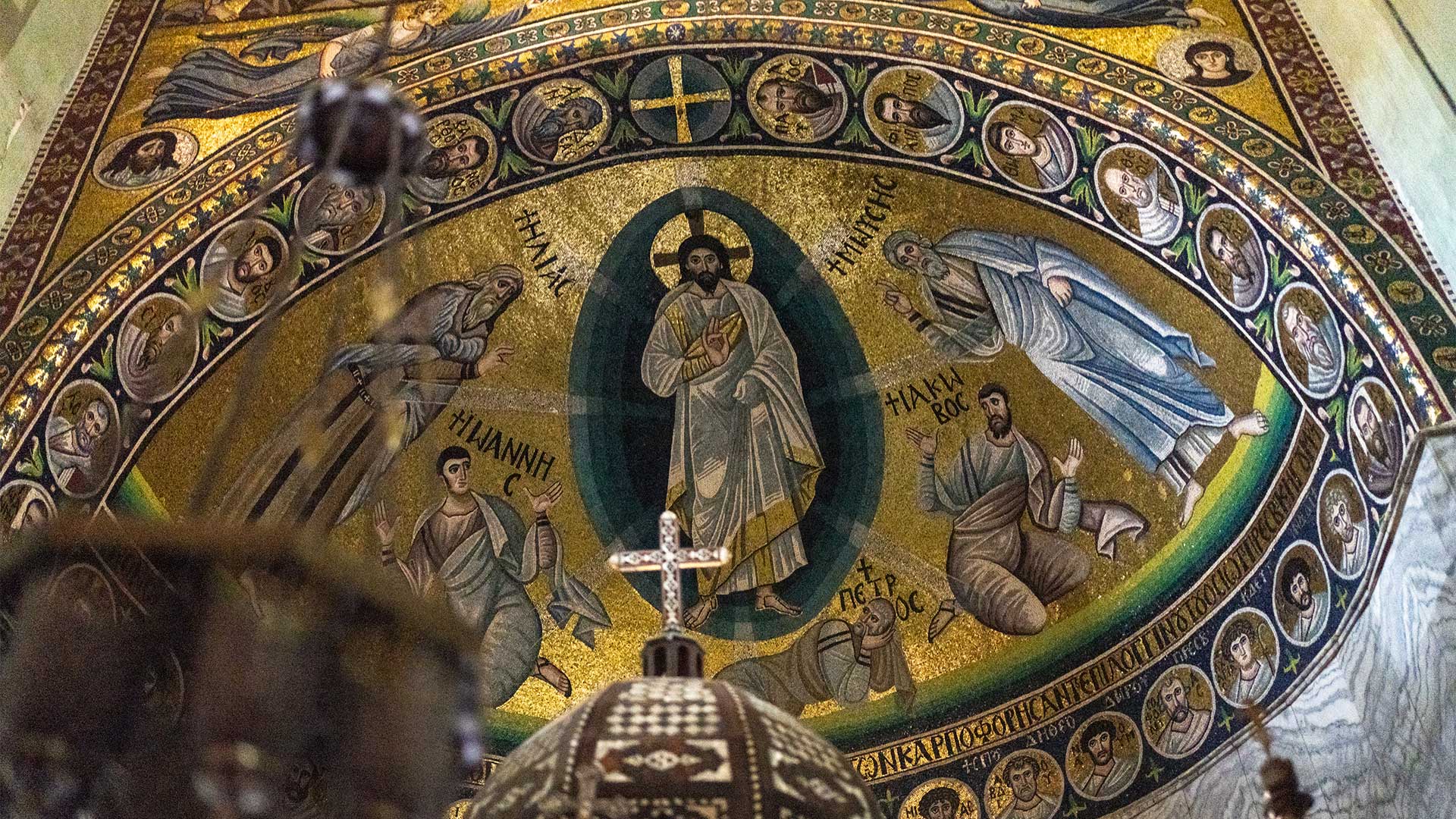 Το λαμπρότερο, ωστόσο, σημείο του ναού αποτελεί η κόγχη του ιερού, διακοσμημένη με ένα από τα σημαντικότερα ψηφιδωτά της εποχής του Ιουστινιανού, από τα ελάχιστα που διασώθηκαν στην Ανατολική Μεσόγειο. Η κεντρική παράσταση απεικονίζει τη Μεταμόρφωση του Χριστού, με τους προφήτες Μωυσή και Ηλία, που και οι δύο έδρασαν στην έρημο του Σινά. Σε δευτερεύουσες συνθέσεις παρουσιάζονται σιναϊτικά επεισόδια από τη ζωή του προφήτη Μωυσή: το όραμα της Ακατάφλεκτης Βάτου και η παραλαβή των Εντολών. Τέλος, σε κεντρικό σημείο εικονίζεται ο βασιλιάς και προφήτης Δαυίδ, παράσταση που οι ιστορικοί ερμηνεύουν ως έμμεση αναφορά στον ίδιο τον Ιουστινιανό.