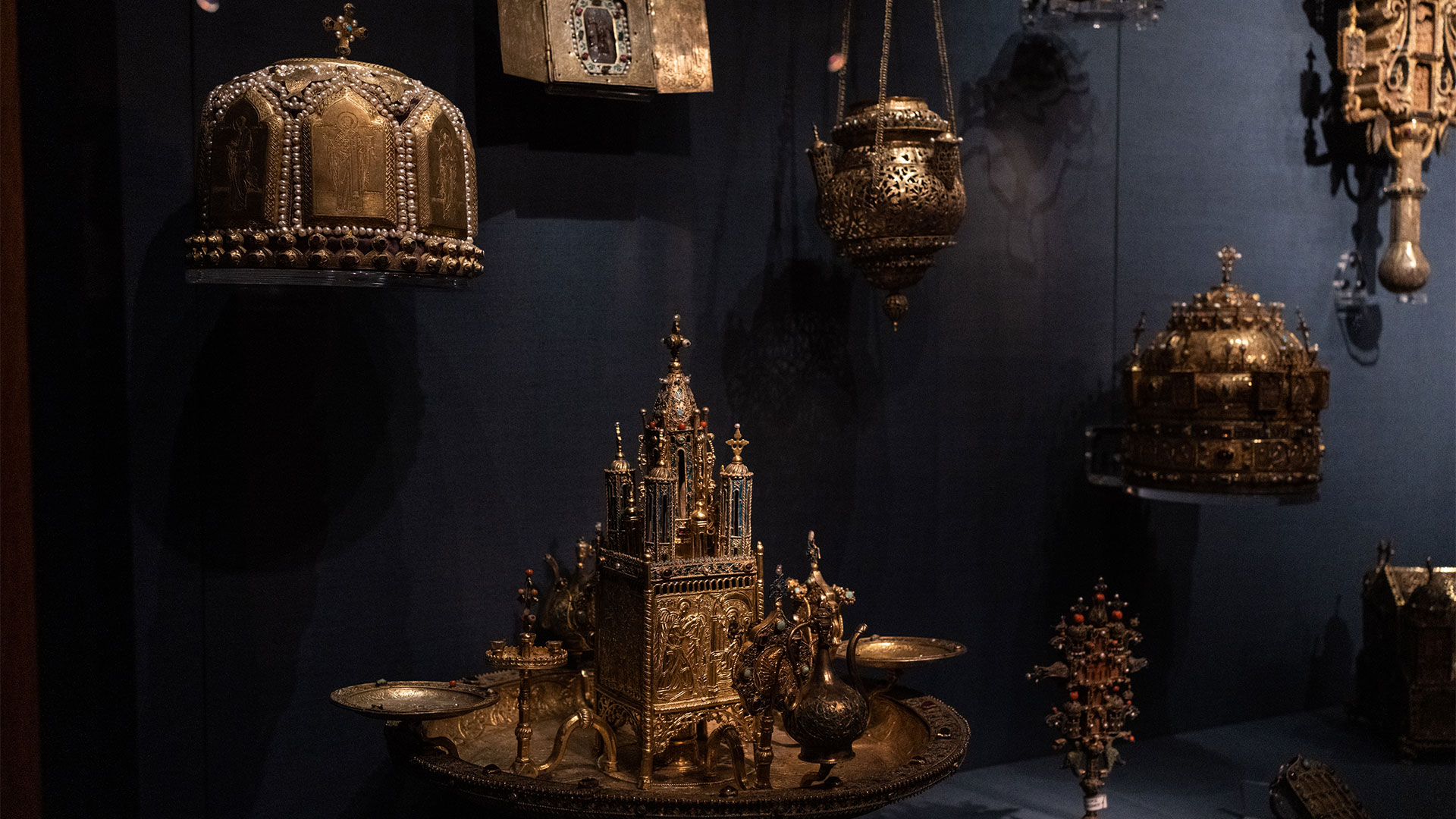 Στο Σκευοφυλάκιο συναντά κανείς επίσης εικόνες της ακμής των Μακεδόνων, Κομνηνών και Παλαιολόγων αυτοκρατόρων της Κωνσταντινούπολης ή έργα που σχετίζονται με τη λεγόμενη σταυροφορική τέχνη της Ανατολικής Μεσογείου. Αφιερώματα από όλο τον κόσμο, όπως το Άγιο Ποτήριο, δώρο του Καρόλου ΣΤ ́ από τη Γαλλία (1411 μ.Χ.), έργα αργυροχρυσοχοΐας από τη Γεωργία, τη Ρωσία, τη Μολδοβλαχία, χρυσοκέντητα άμφια και υφάσματα από την Κρήτη και τη Βιέννη, δείχνουν την εμβέλεια του προσκυνήματος και την αγάπη του χριστιανικού κόσμου προς τον ιερό τόπο και την αγία Αικατερίνα.